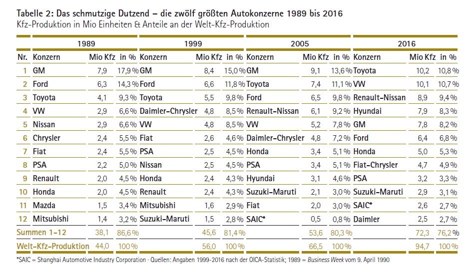 Betrachtet man sich in den Tabellen 1 und 2 die regionale Verteilung der Weltautoproduktion im Zeitraum 1999 bis 2016 und die zwölf weltweit größten Autokonzerne – hier im Zeitraum 1989 bis 2016 – dann ergibt sich ein interessantes Bild.